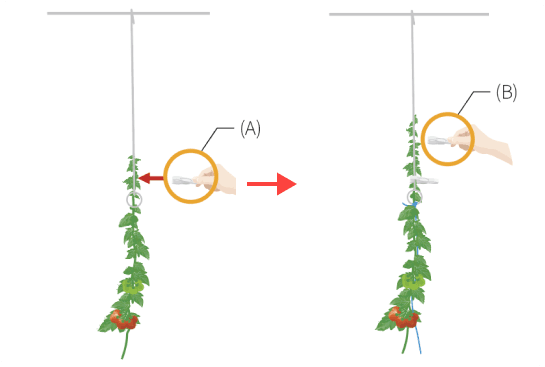 2CP-609で誘引し、茎の成長点がC-681-Pに掛かってきたら、下部の輪の直上にCP-609を取付けて、先端付近をガイドする(A)。Aの段階より少し茎が伸びたら、CP-609の2つ目を使用(B)し、成長に合せてCP-609の使用数量を増やす(3 〜5個)。